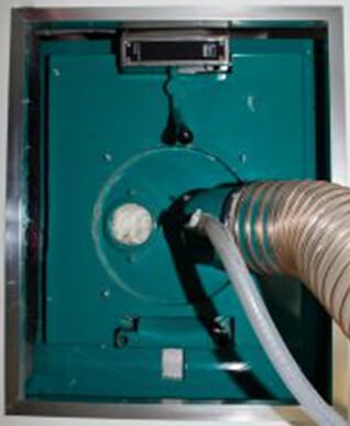 Weiter geht es für die Daunen/Federn in die Sortierkammer wo Staub und verklumpte Daunen/Federn aussortiert werden, dies funktioniert über einen Luftstrom der die großen Daunen/Federn nach oben befördert und das schwere am Boden liegen lässt.
